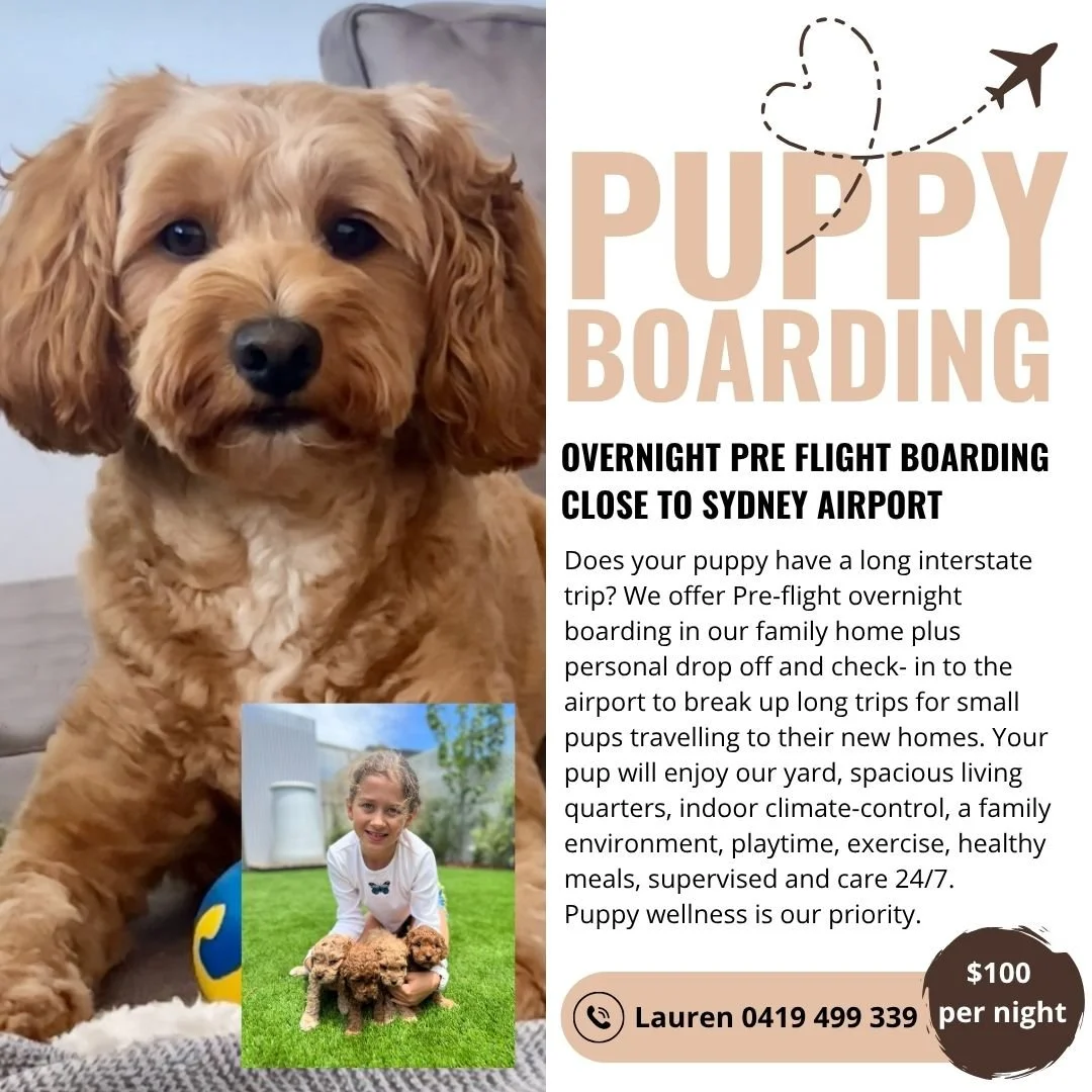 We offer Pre-flight overnight boarding in our family home plus personal drop off and check- in to the airport to break up long trips for small pups travelling to their new homes. Your pup will enjoy our yard, spacious living quarters, indoor climate-control, a family environment, playtime, exercise, healthy meals, supervised and care 24/7.